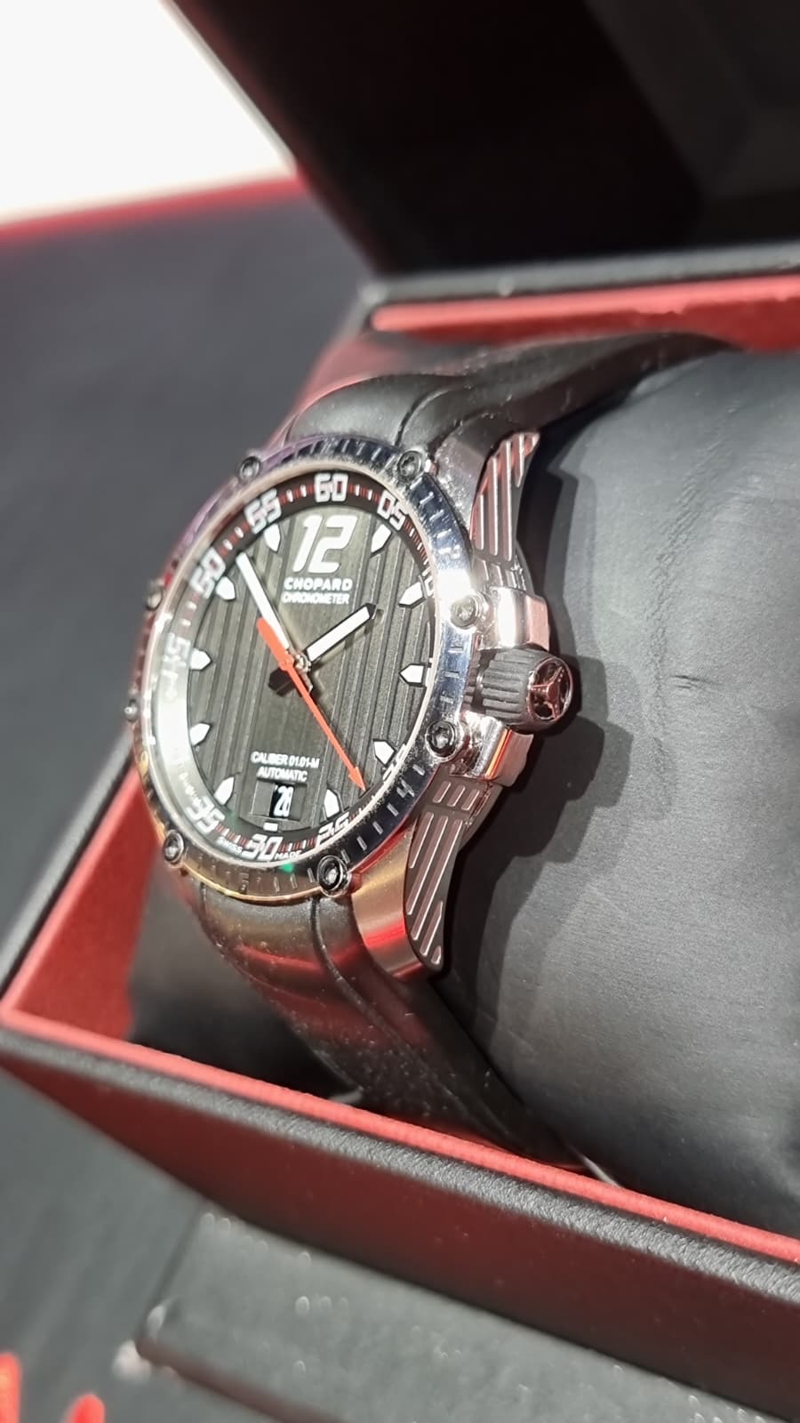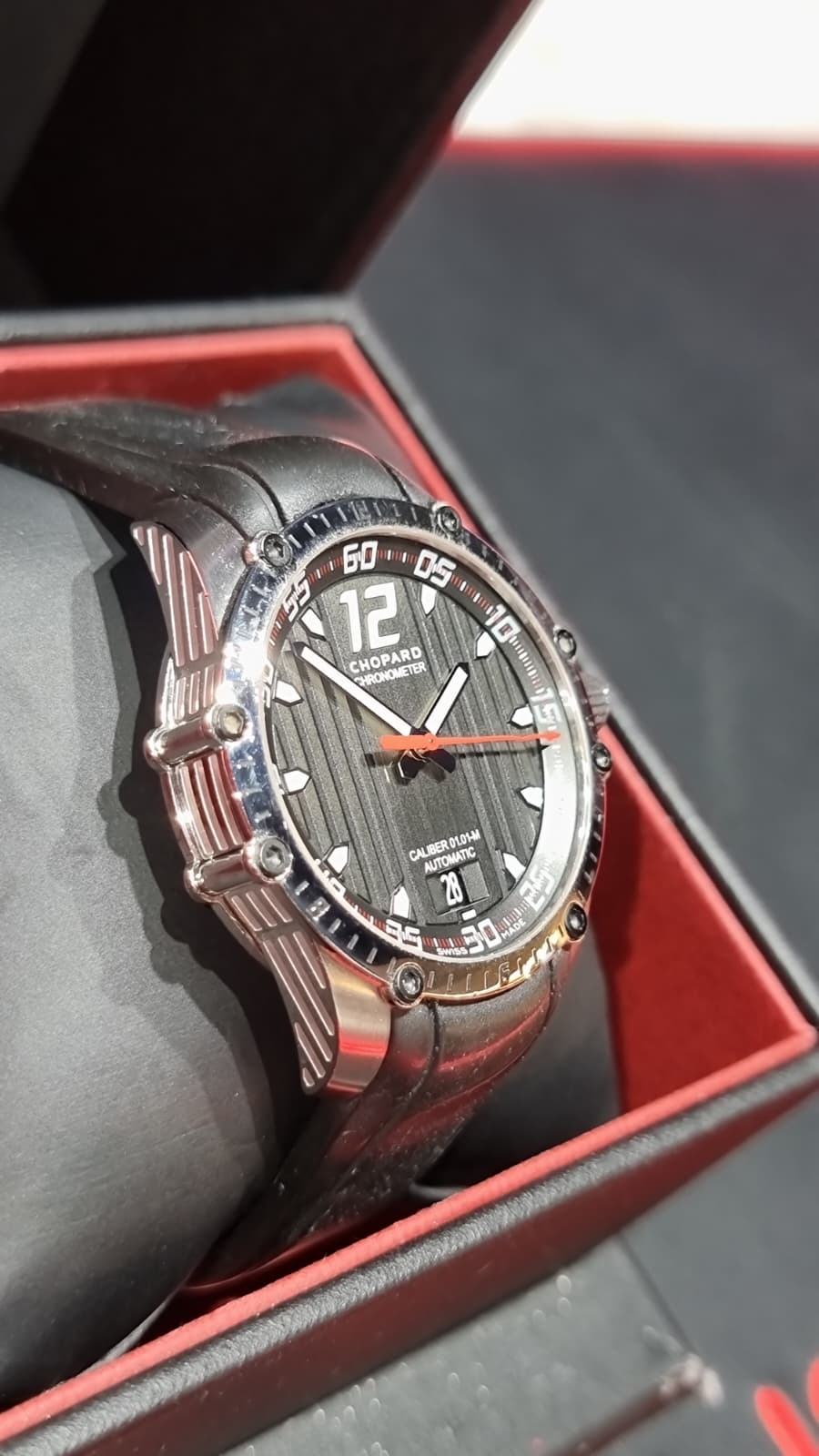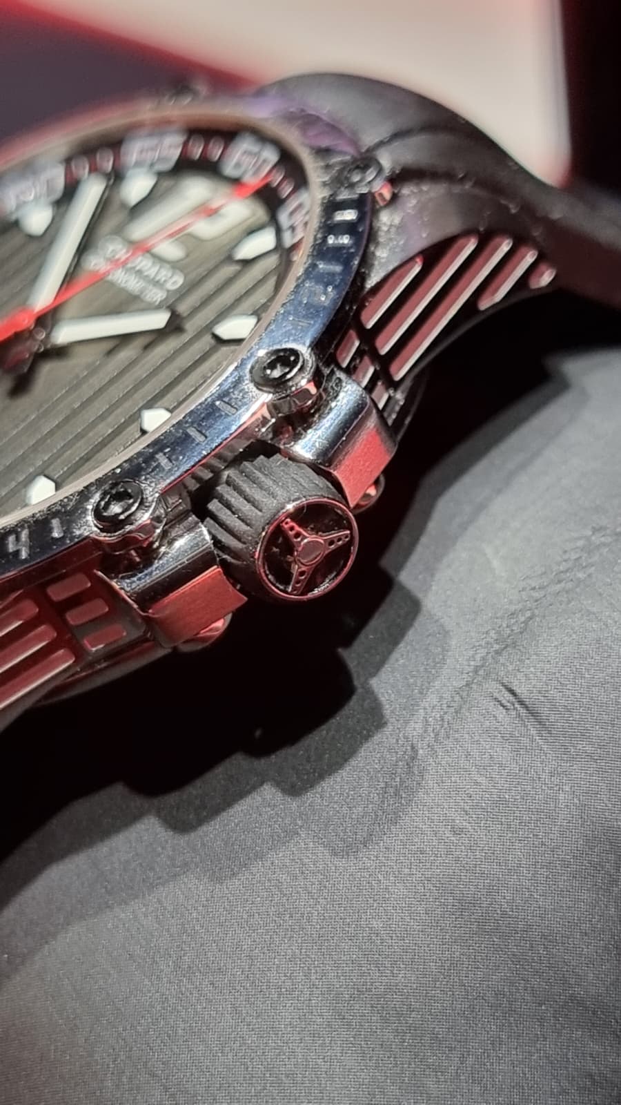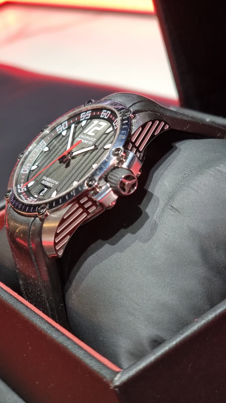 Inspirado en el mundo del automovilismo deportivo… pulsera de caucho evocando a las bandas de rodadura, el segundero rojo y las franjas verticales de la esfera como la de los salpicaderos, los grabados de la caja evocando a las aletas de refrigeración de los motores y sin olvidar la corona, que cuenta con el detalle de un volante grabado.