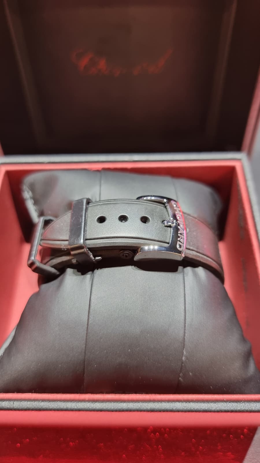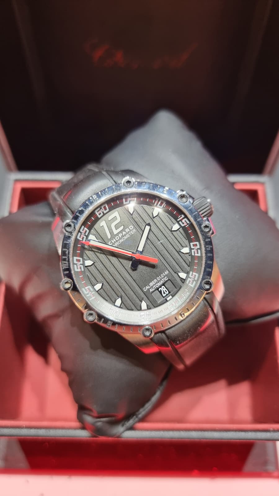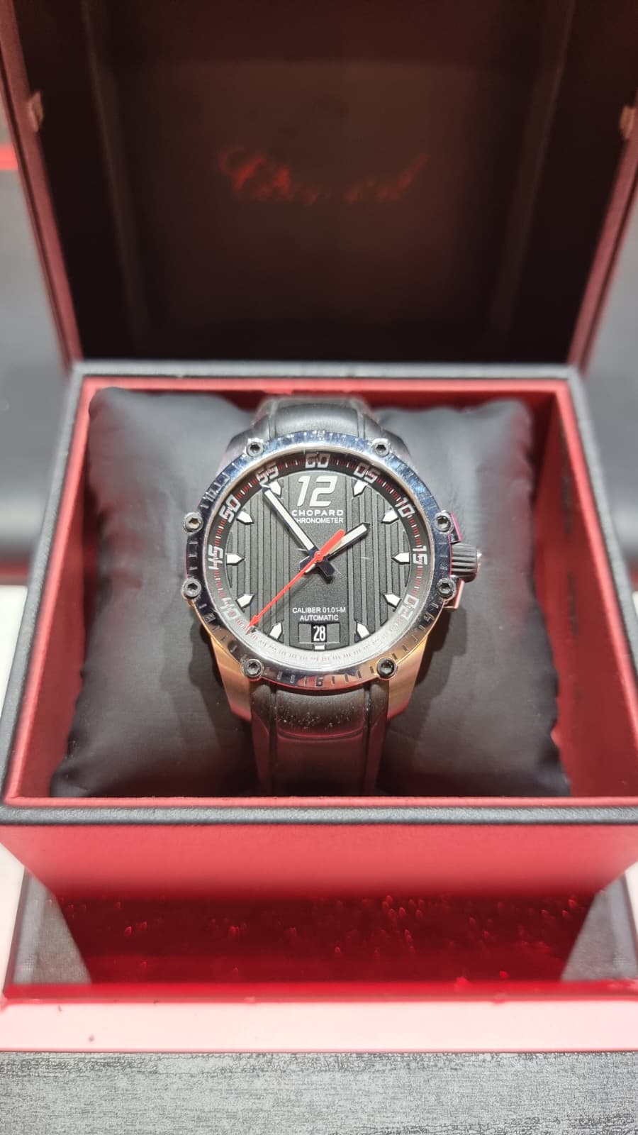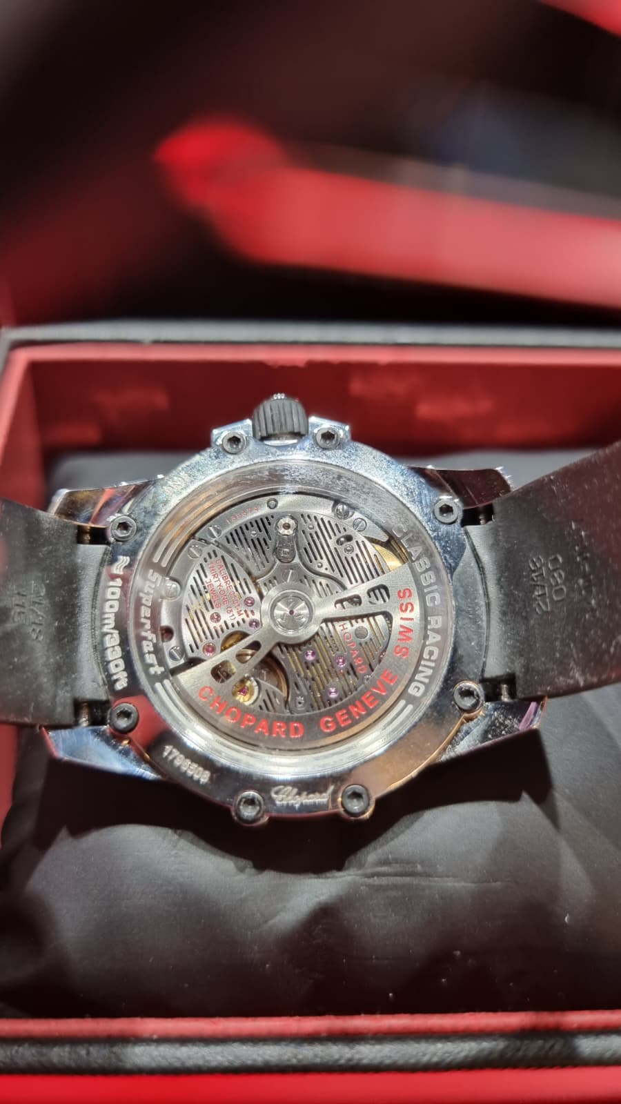 Inspirado en el mundo del automovilismo deportivo… pulsera de caucho evocando a las bandas de rodadura, el segundero rojo y las franjas verticales de la esfera como la de los salpicaderos, los grabados de la caja evocando a las aletas de refrigeración de los motores y sin olvidar la corona, que cuenta con el detalle de un volante grabado.